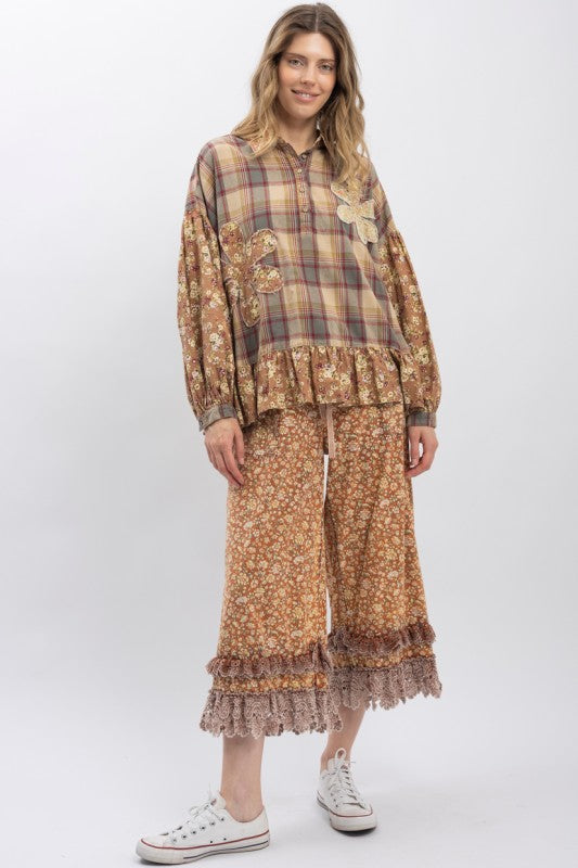 Blue Velvet Flower Patchwork Half Button Ruffle Shirt