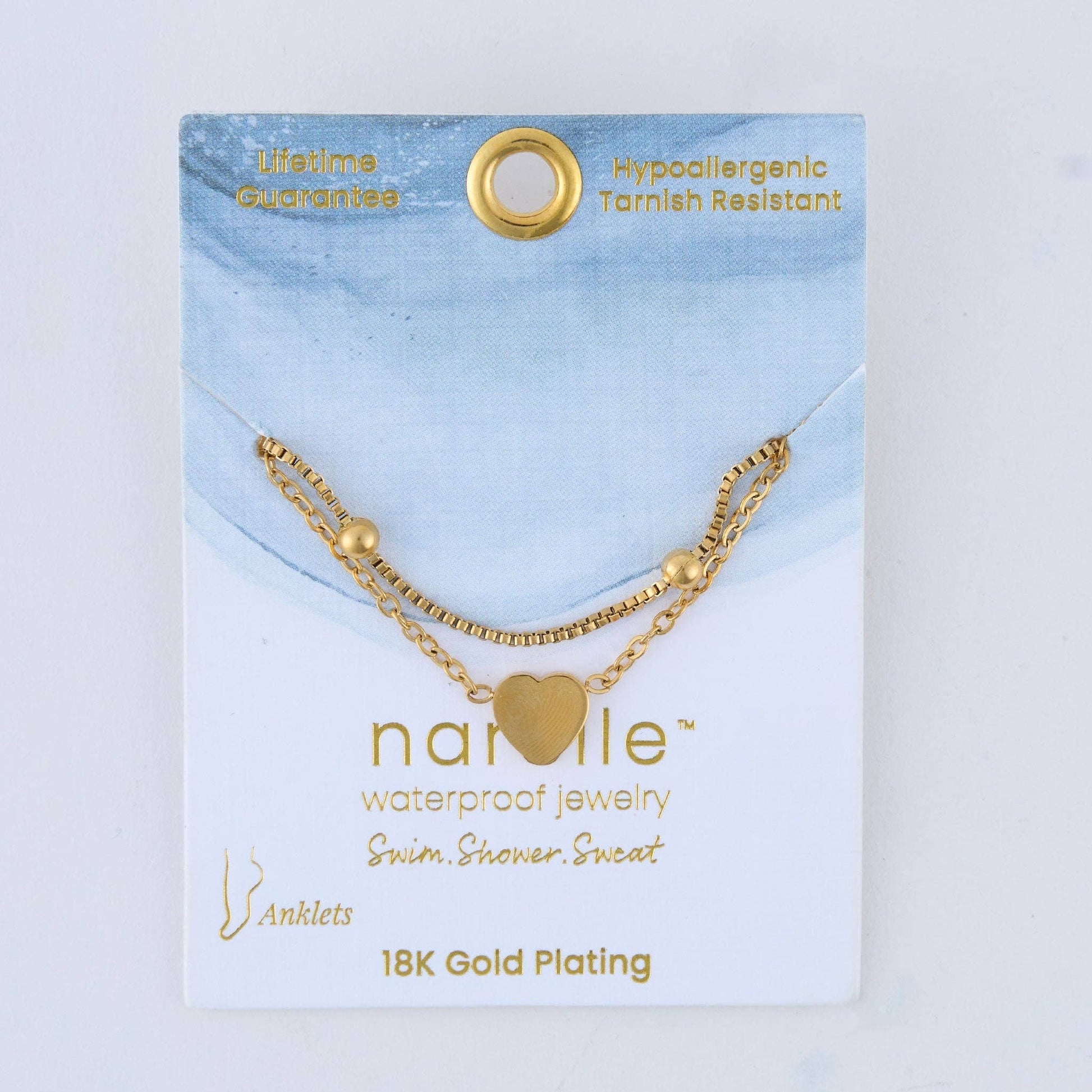 A modern take on a classic, the Narelle Waterproof Multi Row Heart Anklet offers two chains in a chic gold with cute heart charm detailing. Designed to help you achieve a curate stacked look, this minimalist anklet is the perfect finishing touch to any summer outfit. Waterproof, 18K gold plated and made with a specialized PVD technique to withstand the rigors of life, from swimming and showering to sweating through your most intense workouts, all without ever losing its shine. waterproof jewelry, gold jewelry, stainless steel jewelry, fade proof, tarnish resistant, water resistant, Real Gold Dipped, tarnish-free, non-tarnish, water proof, sweatproof jewelry, Fade Resistant, Anti-oxidation,