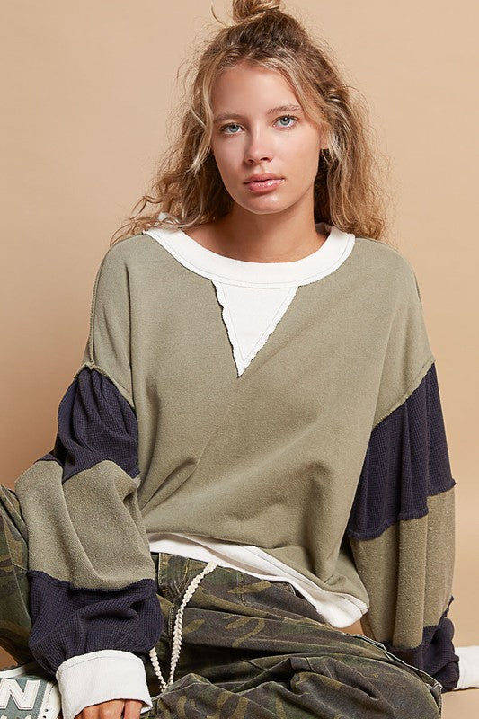 Hensley Oversize round neck color block long sleeve top