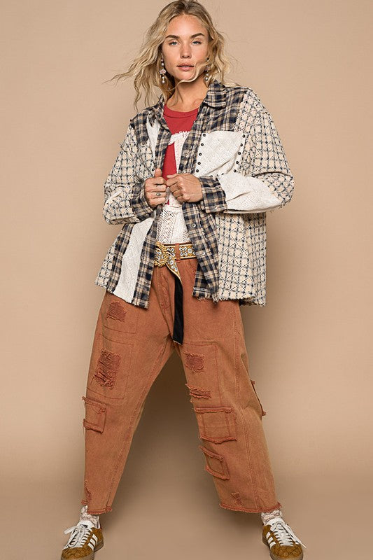 Enhance your wardrobe with our oversized long sleeve lace contrast shirt in plaid. The delicate lace detail adds a touch of elegance to the classic plaid print, making it perfect for any occasion. Stay stylish and stand out effortlessly.