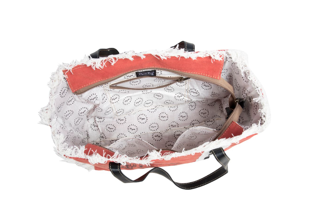 This bag features plenty of space to carry a variety of items, from clothes to groceries! A dimensional front, with its gorgeous two-tone canvas, fanciful cactus scene overprinting, and frayed-edge treatments make for a delightfully textured look. An additional zippered pocket on the back adds handy convenience. Zipper close top and durable dark leather carrying/shoulder straps finish everything out.