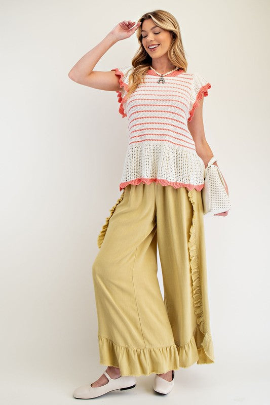 Elevate your wardrobe with our Sammy Stripe Patterned Knit Sweater Top. Featuring short wing sleeves, a elegant back tie closure, and a relaxed and loose fit, this top is both stylish and comfortable. The ruffled bottom and wavy edge detailing add a touch of femininity, while the slightly see-through fabric adds a hint of allure. Made with 60% cotton and 40% acrylic, this top is perfect for any occasion. Available in small, with measurements of 23.25" in length and 17" in bust.